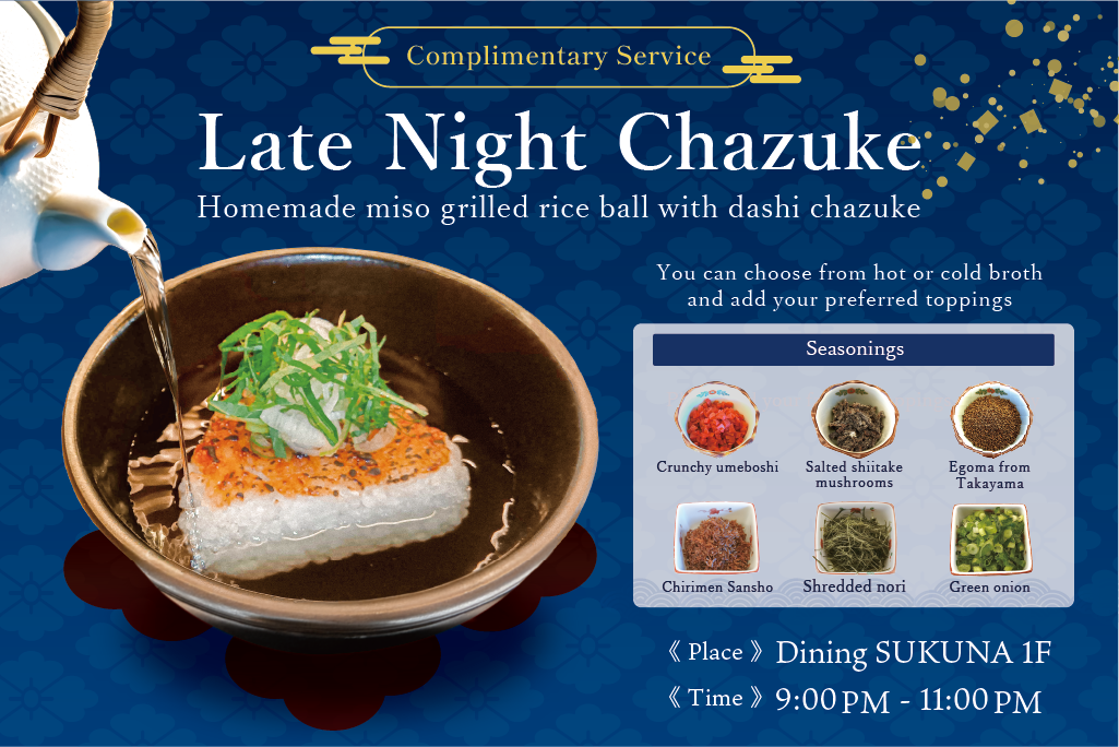 Available from 9:00 p.m. at the restaurant. Guests may enjoy one complimentary serving of either ochazuke or sweet red bean soup